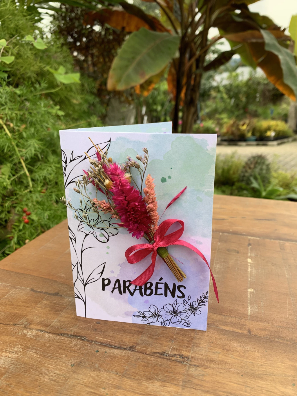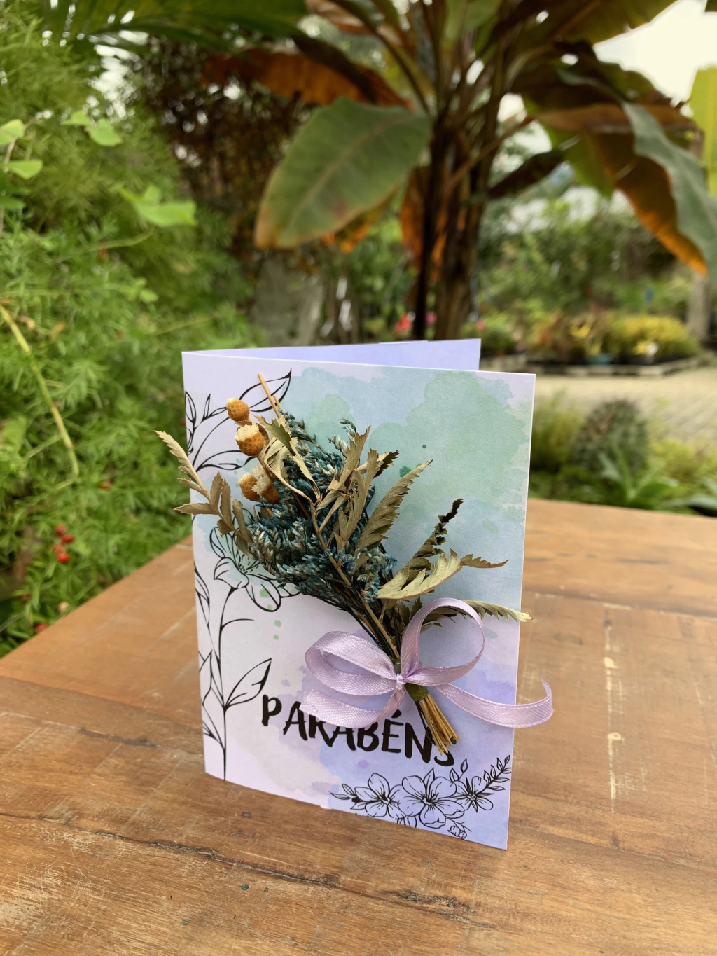 Um cartão único e especial, impresso em diferentes modelos e decorado com lindas flores secas.
