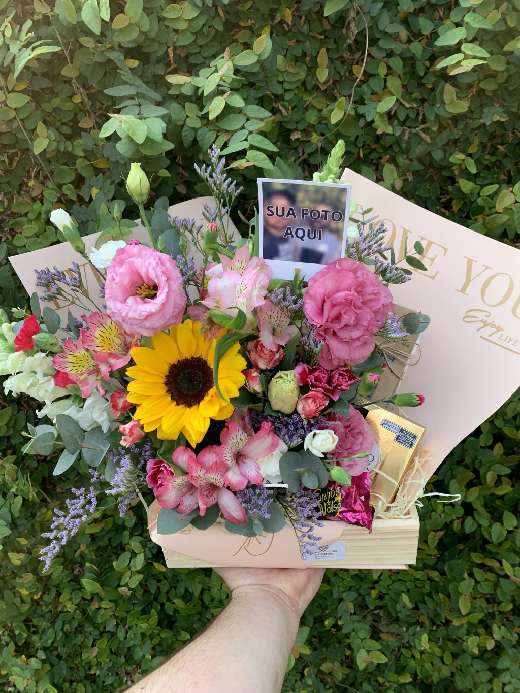 Antes de finalizar o pedido terá um campo para você inserir uma mensagem que acompanhará o presente. Você pode escrever uma mensagem de até 350 caracteres (sem custo)